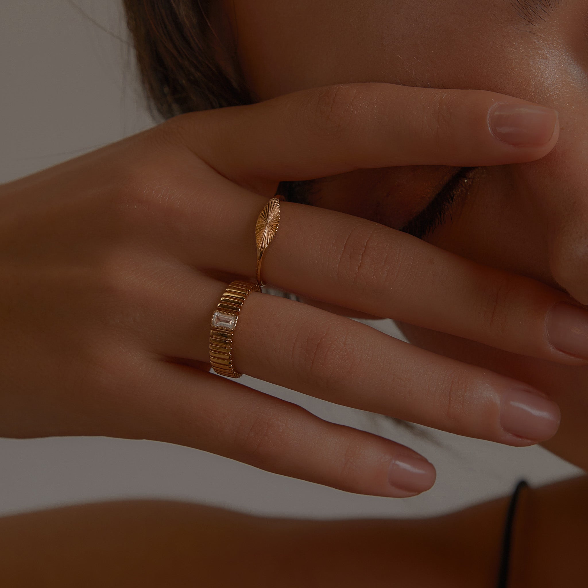 Our gold vermeil pieces feature a thick layer of 18k gold plated over sterling silver, crafted with care in an Responsible Jewelry Council certified production house. While the industry standard for gold vermeil is 2.5 microns, we go the extra mile by opting for 3-microns thickness along with an anti-tarnishing coating for enhanced shine and durability. This makes our gold vermeil pieces comparable to gold-filled jewelry in longevity while also being a great option for those with sensitive skin, offering both beauty and quality.